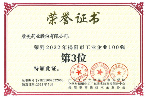 道道网讯 为深入贯彻落实国家、广东省和揭阳市关于“制造业当家”“高质量发展”的决策部署,准确把握新阶段、新理念,7月12日,由揭阳市工信局指导、广东工业大学先进制造学院、榕江实验室、揭阳市高新技术企业协会联合主办的“揭阳市工业企业100强发布活动”在揭阳举行。康美药业凭借优异的市场表现和强劲的综合实力,上榜揭阳市工业企业100强,荣列第3位!