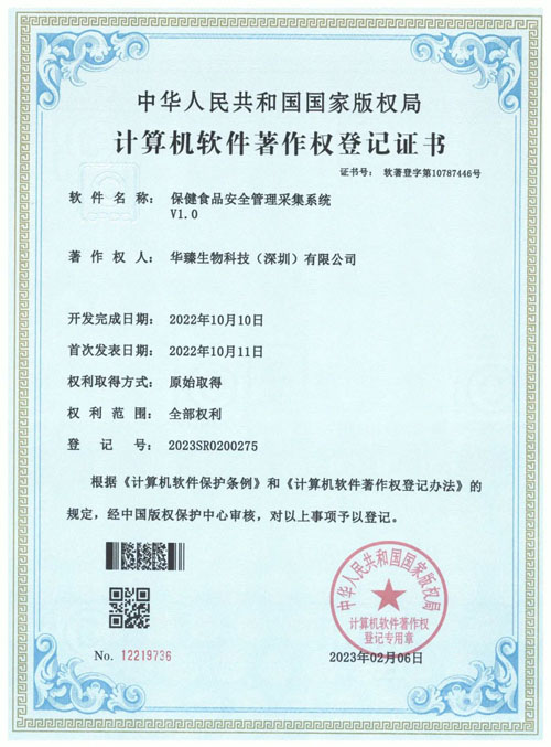同时,华臻自主研发的《保健食品安全管理采集系统V1.0》《保健食品检验一体化集成服务系统V1.0》《保健食品追溯信息化采集系统V1.0》3项软著,顺利通过中国版权保护中心的严格审核,获得由国家版权局颁发的3项计算机软件著作权登记证书。
