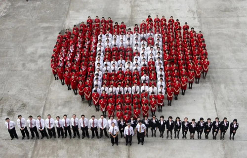 完美公司三位领导与完美员工一起,组成“爱心完美”图案