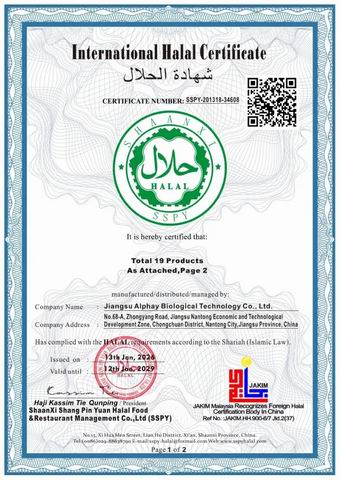 道道网讯 2026年1月13日,江苏安惠生物科技有限公司(Jiangsu Alphay Biological Technology Co., Ltd.)获得国际HALAL认证证书,证书编号为SSPY-201318-34608。该认证由马来西亚伊斯兰发展署(JAKIM)认可,标志着安惠生物科技的相关核心产品符合伊斯兰教法(Shariah)规定的HALAL标准,为其在全球清真市场的布局提供了重要保障。